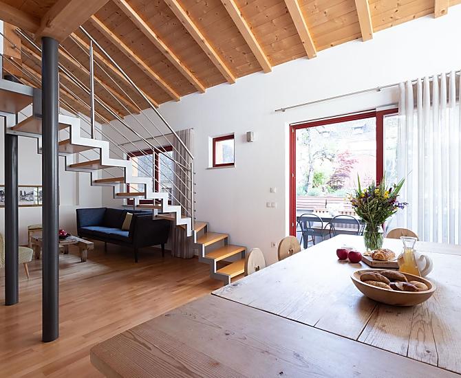 Náš pečlivě zrekonstruovaný rekreační dům se nachází částečně v idylickém dvoře naší usedlosti Pastreinbach a otevírá se na západ s krásným výhledem na okolní vinice a Mendelkamm. Je odsud přímý vstup do naší velké zahrady plné kvetoucích květin, keřů a ovocných stromů a na nově vysazenou vinici.