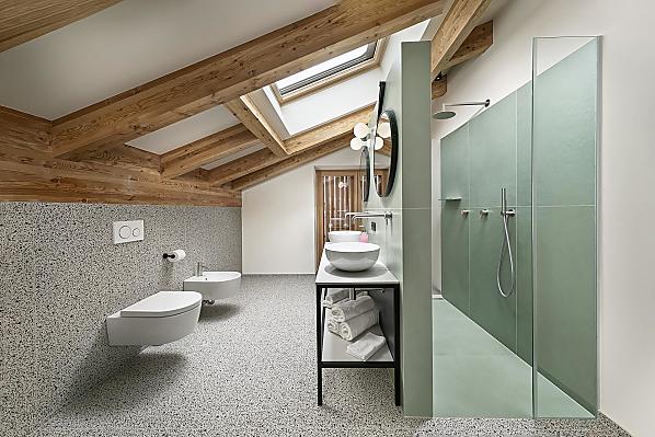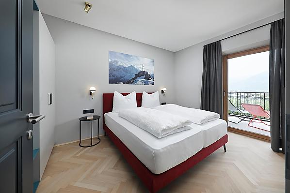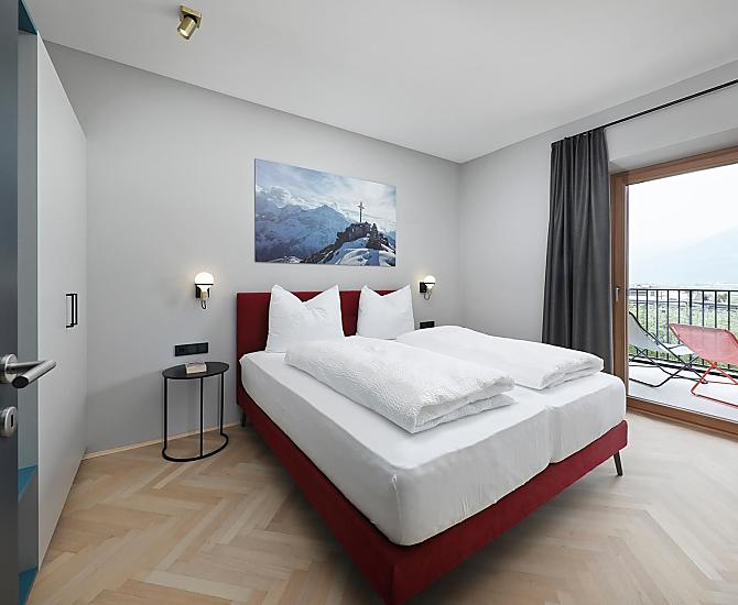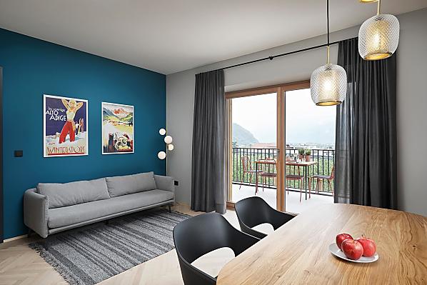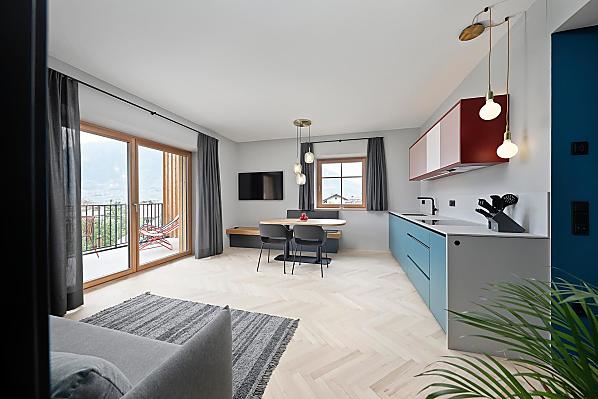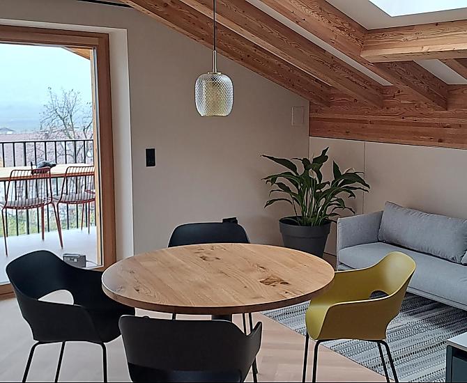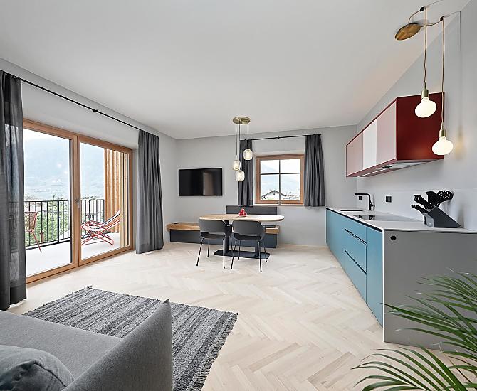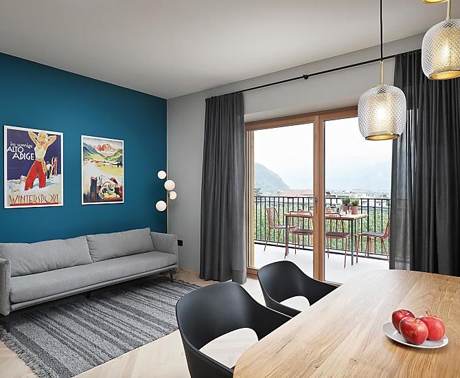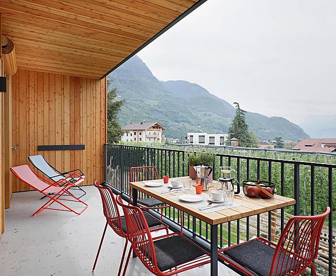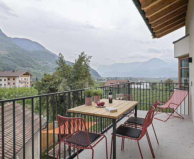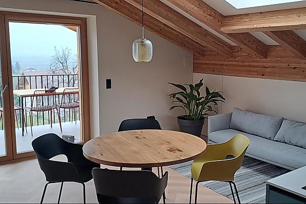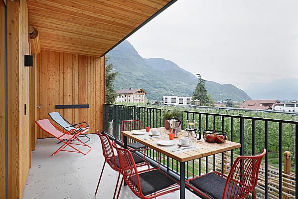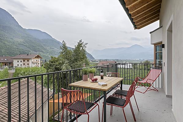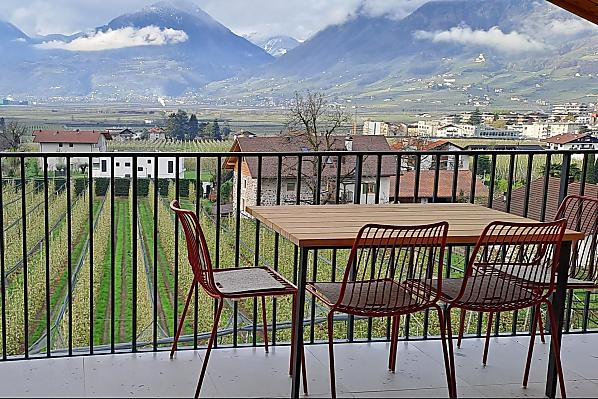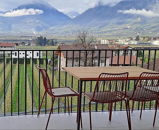 Dům se čtyřmi novými apartmány, společenská místnost se společnou kuchyní, terasa a zahrada. Klidná poloha v zeleni, nedaleko města. Nerušený výhled do údolí Etschtal.