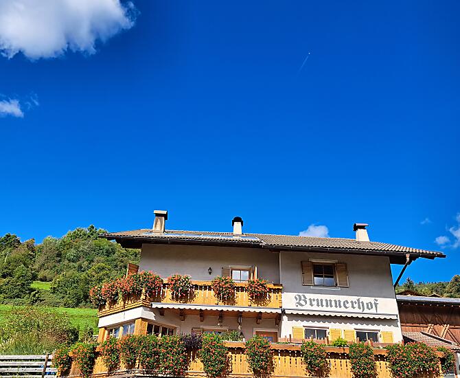 Brunnerhof byl poprvé zmínen roku 1747 jako Prunhof. Od tech dob byl dvakrát prestaven obytný dum a jednou stáj. V roce 1995 k nám prijeli na dovolenou na statku první hosté. Hostum je k dispozici 5 pokoju. Od roku 2015 si naši hosté mohou rezervovat také rekreacní apartmán. V léte podáváme snídane s domácími selskými produkty na slunné terase a v zime v útulné, drevem obložené selské svetnici. O kvetiny na statku a v jeho okolí se s láskou stará selka. Dnes má statek 12,3 hektaru luk, lesa, orné pudy a pastvin. Žijí zde krávy, kocky, psi, králíci, kachny, slepice, ryby a krecci. Prímo nad statkem vede 60 km dlouhá turistická Kaštanová stezka (Keschtnweg) mezi Brixenem a Bolzanem.