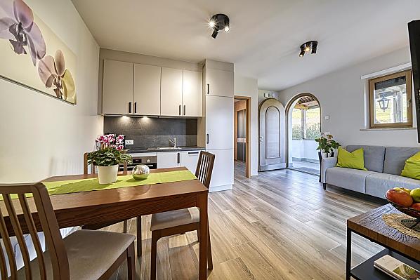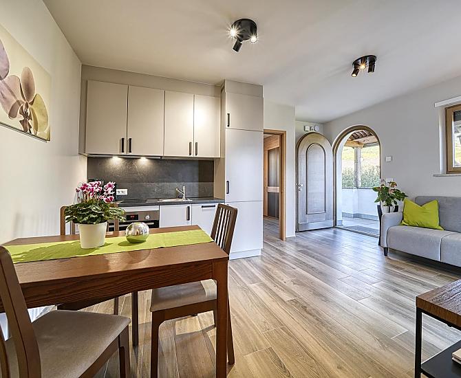 Naše hosty vítáme s radostí a jako uvítací nápoj podáváme sklenku vlastního vína. Rádi vás také překvapíme pestrými talíři čerstvého ovoce. Na vašem balkoně najdete bedýnku se směsí bylinek – nabídněte si podle libosti, aby vaše dovolenkové menu bylo ještě vynikající.
