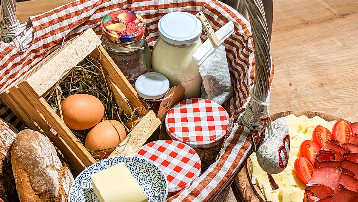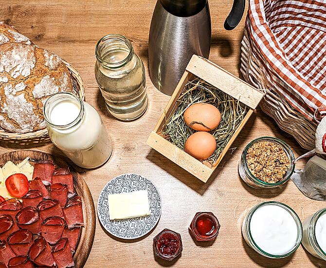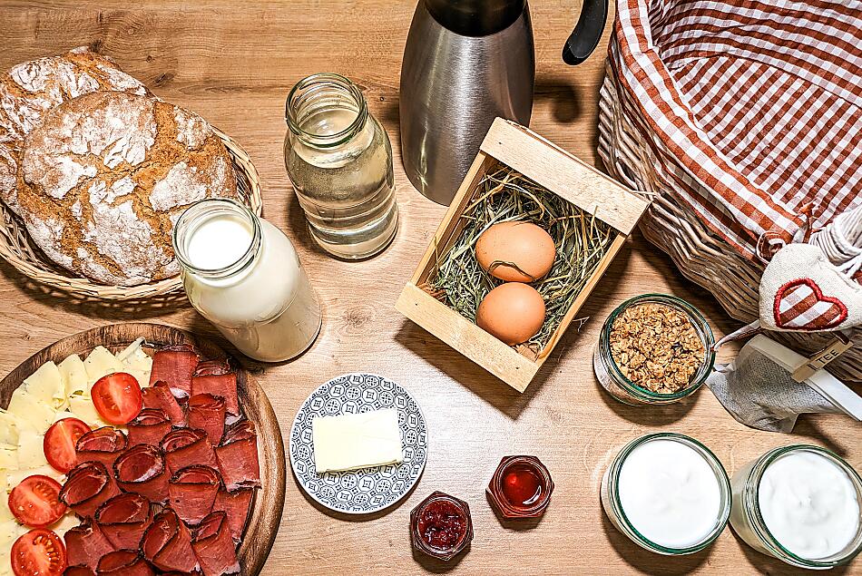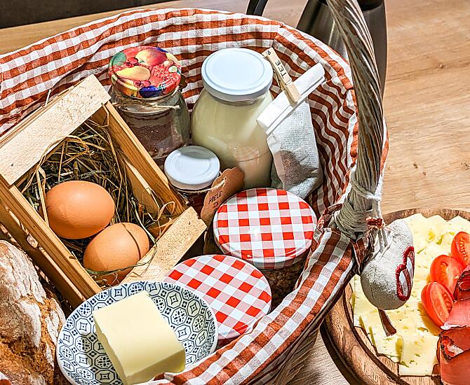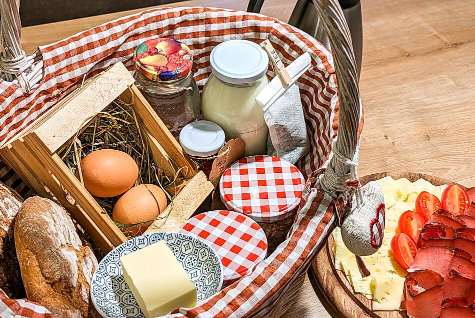 - Snídaně s vlastními produkty ze statku: mléka, máslo, špek, vejce, med, mamelády, sirup, chléb, pečivo
