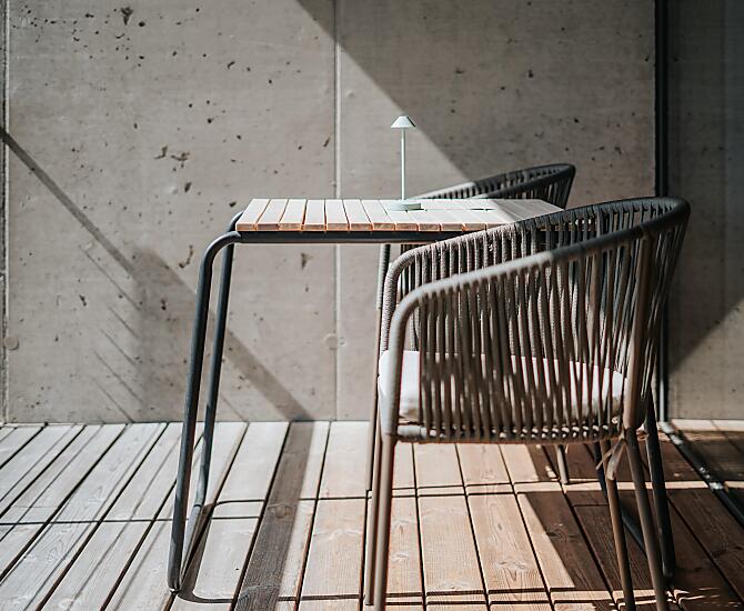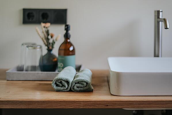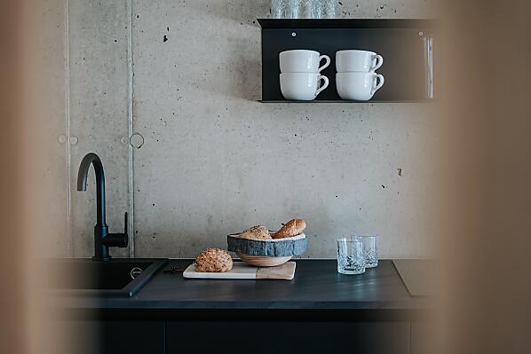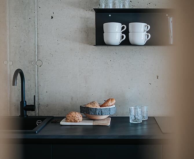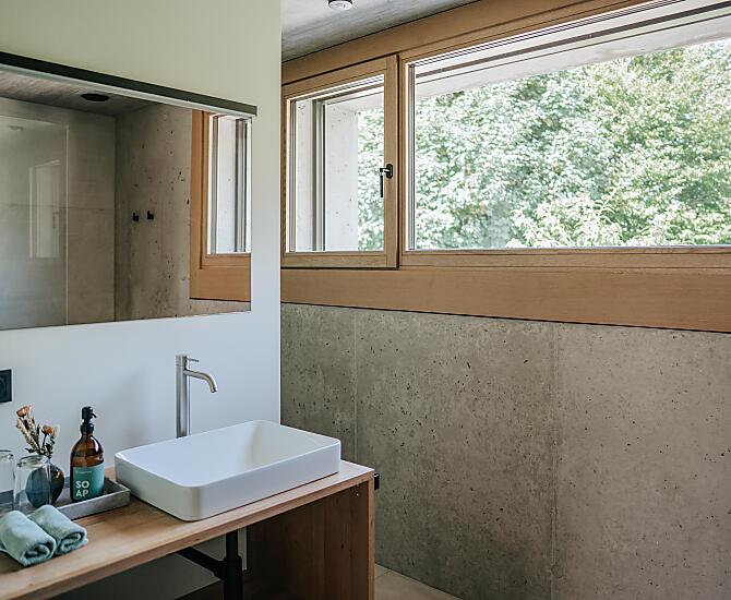 Stěny z izolačního betonu, přírodní dřevo, puristické, omezené na to nejnutnější.