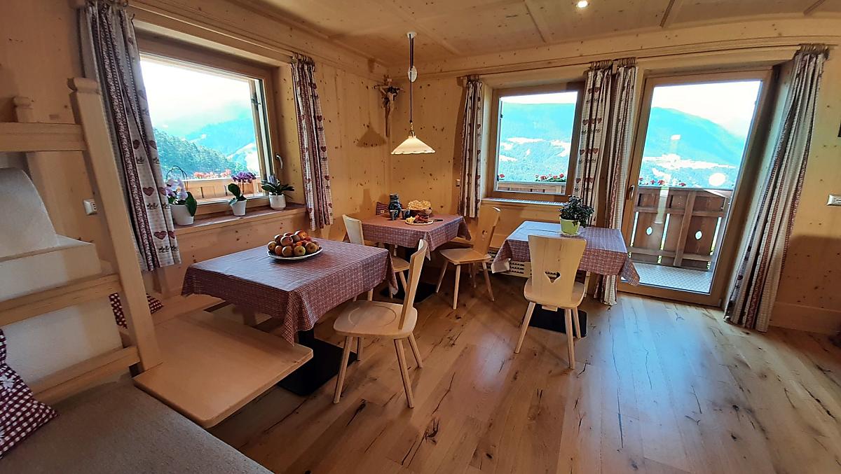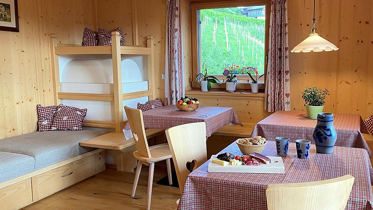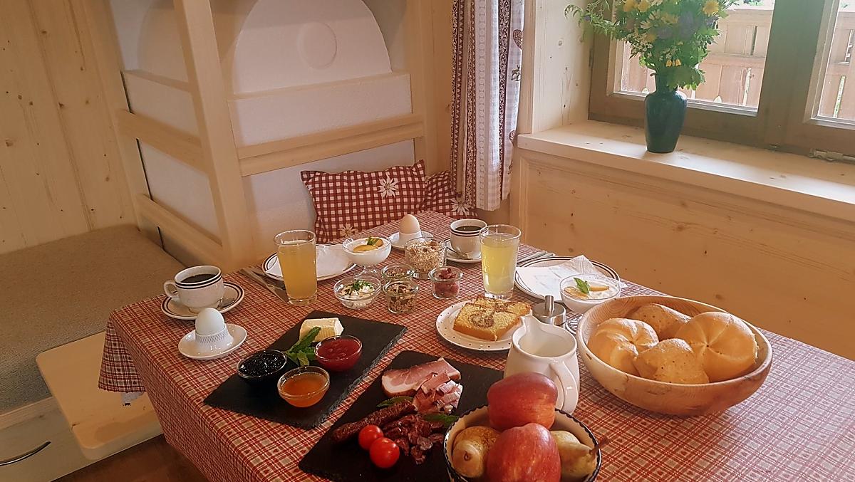 Rádi pro vás připravíme snídani ve světnici našeho statku nebo snídaňový koš do vašeho rekreačního apartmánu. Samozřejmě z našich vlastních produktů ze statku a produktů z Jižního Tyrolska.