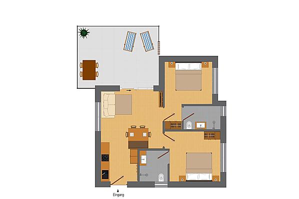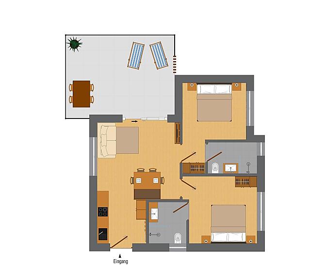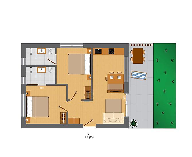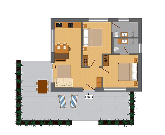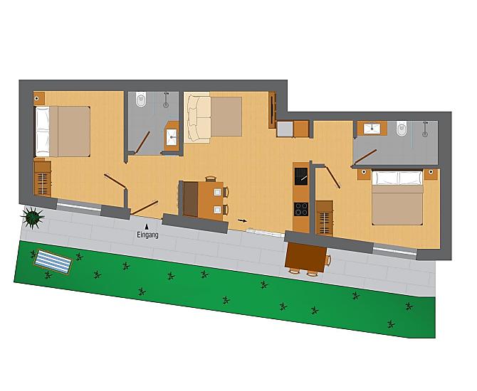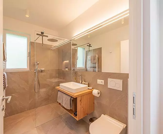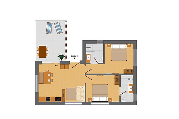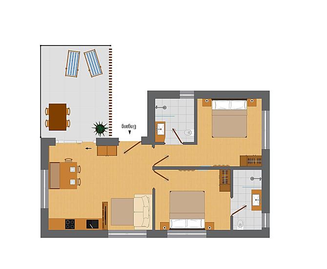 Naše budova se skládá z 5 moderních, útulných a plně vybavených terasovitých prázdninových apartmánů, z nichž každý má 2 ložnice a 2 koupelny.