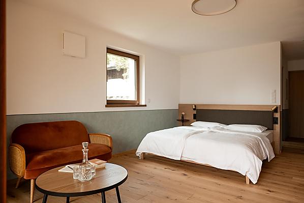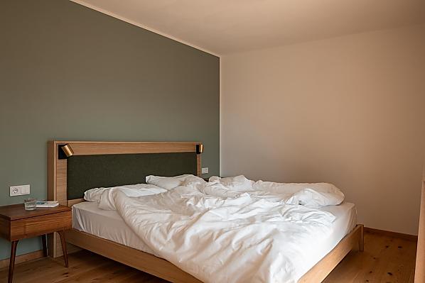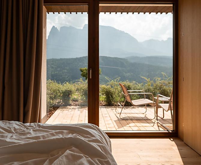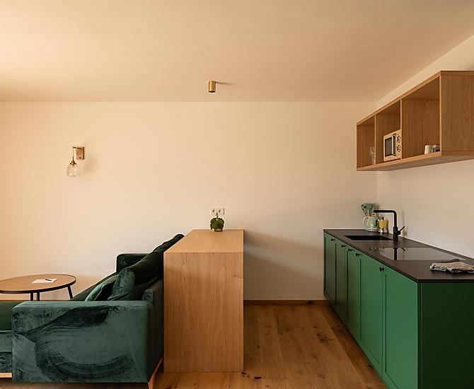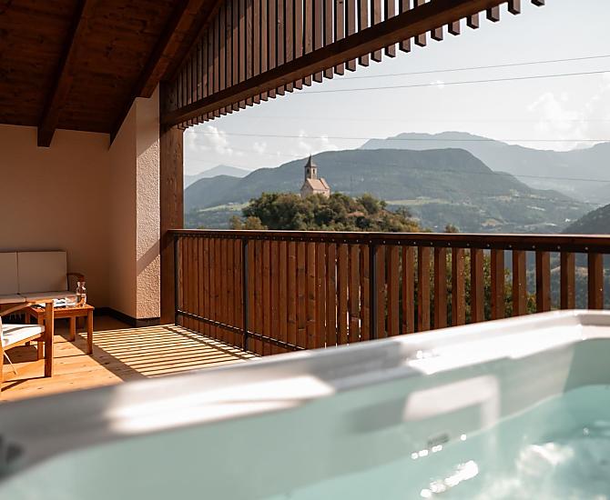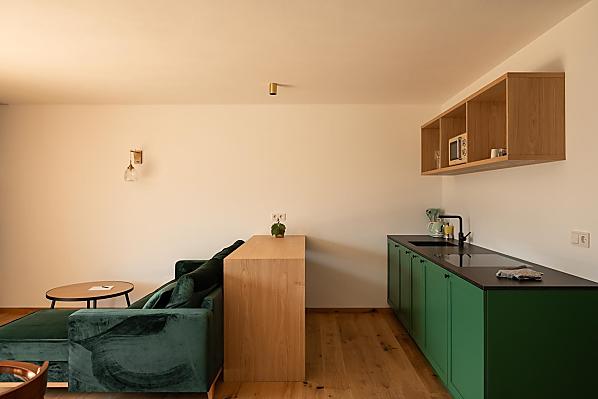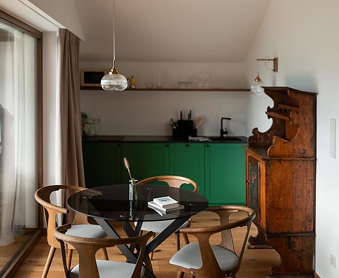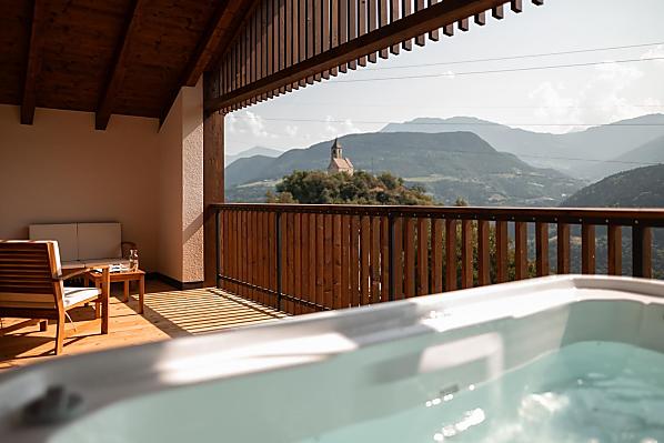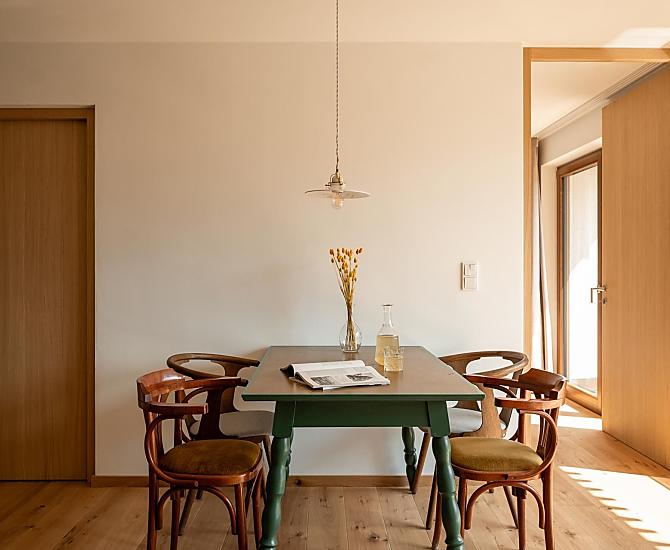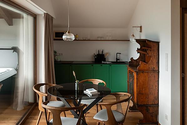 Naše farma se nachází v nadmořské výšce 800 m nad mořem v chráněné kulturní krajinné vesničce Antlas v blízkosti historického kostela sv. Andrease s nádhernými starobylými freskami, který je přístupný veřejnosti. Naše čtyři studio apartmány s úchvatným výhledem na Dolomity se nacházejí v nové budově spojené s historickou farmou. K venkovnímu vybavení patří přírodní koupaliště a vířivka v zahradě. Zařízení pokojů je ručně vyrobeno ze dřeva z našeho vlastního lesa. Výzdoba kombinuje tradiční venkovskou estetiku jižního Tyrolska a alpskou secesi, běžnou na kopci Ritten. Dvakrát týdně umožňujeme hostům do naší kuchyně, aby je seznámili s naší jihotyrolskou kuchyní. Všechny apartmány mají vlastní stravování a kuchyň. Rodinný apartmán a penthouse mají plně vybavené kuchyně.