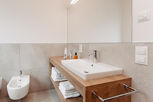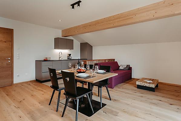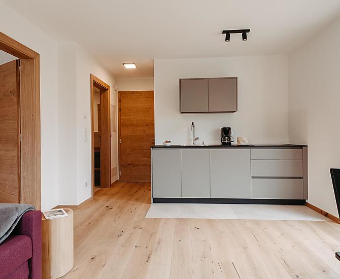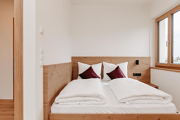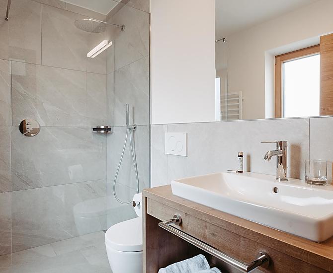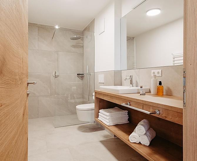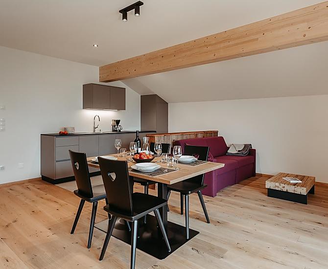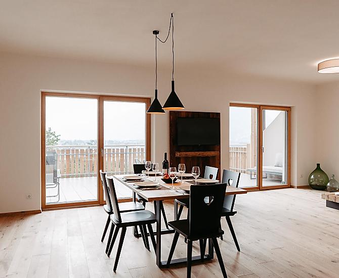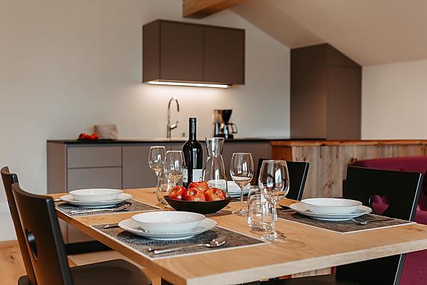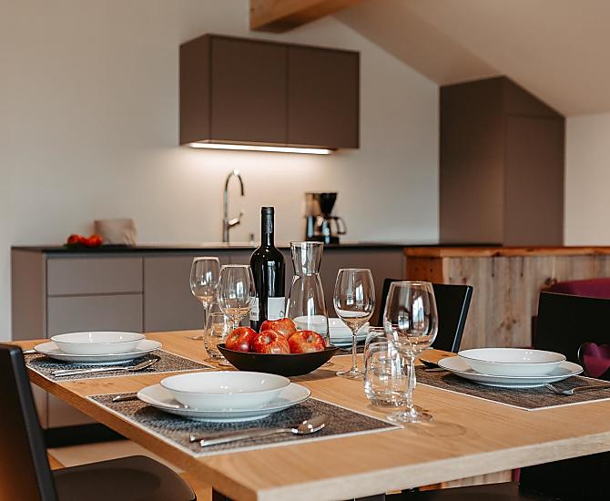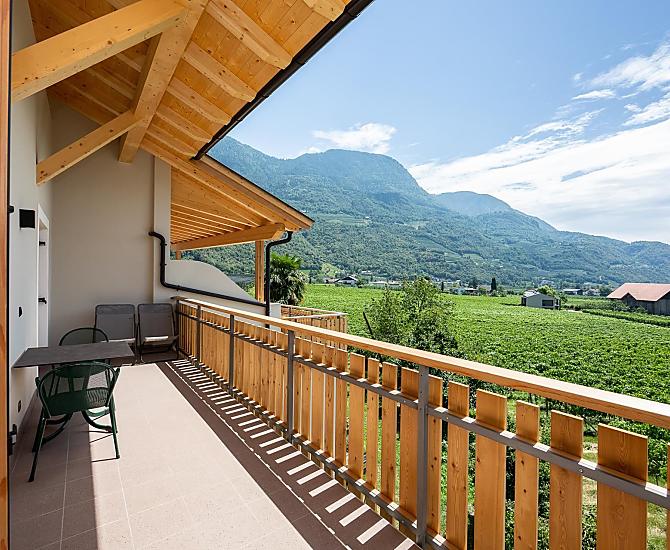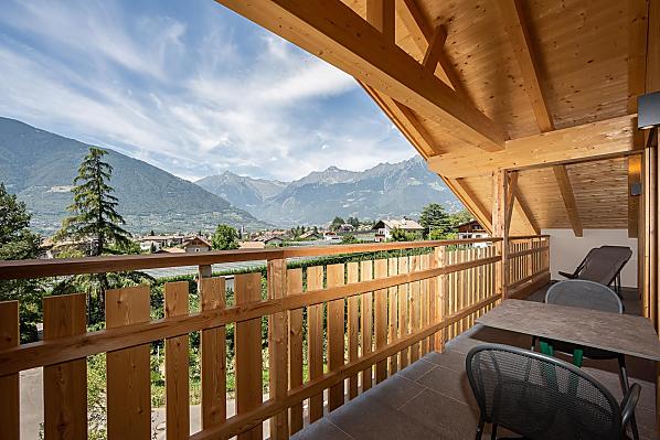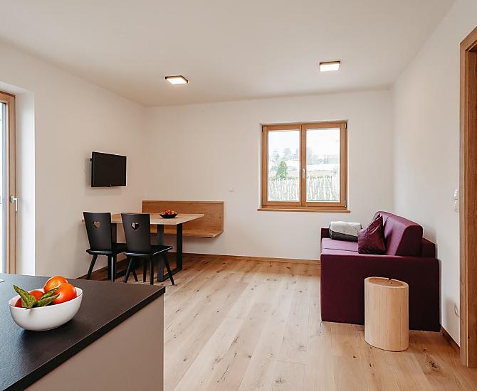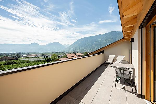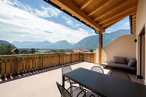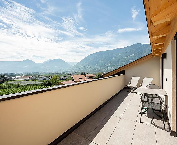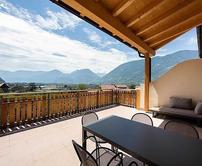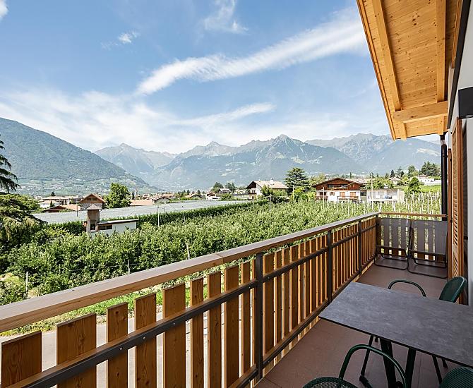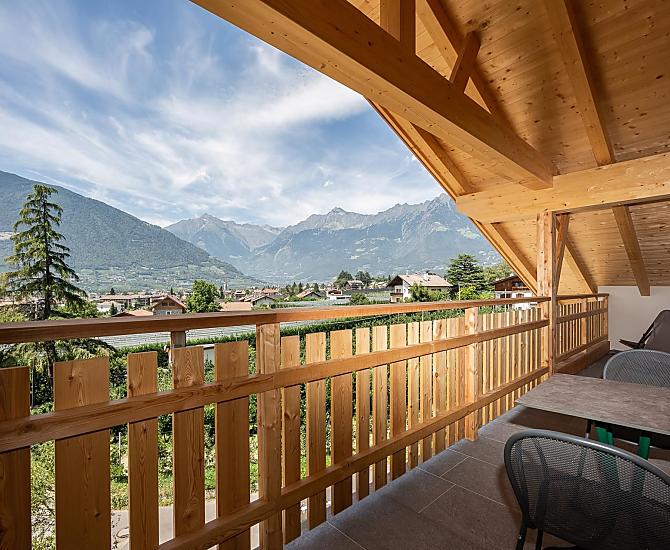 5 nových apartmánů, bazén se slanou vodou a trávníkem ke slunění, vysněný výhled, spousta klidu a pohody, blízko centra Merana, víno a jablka: to je Torgglbauer.