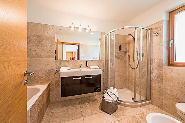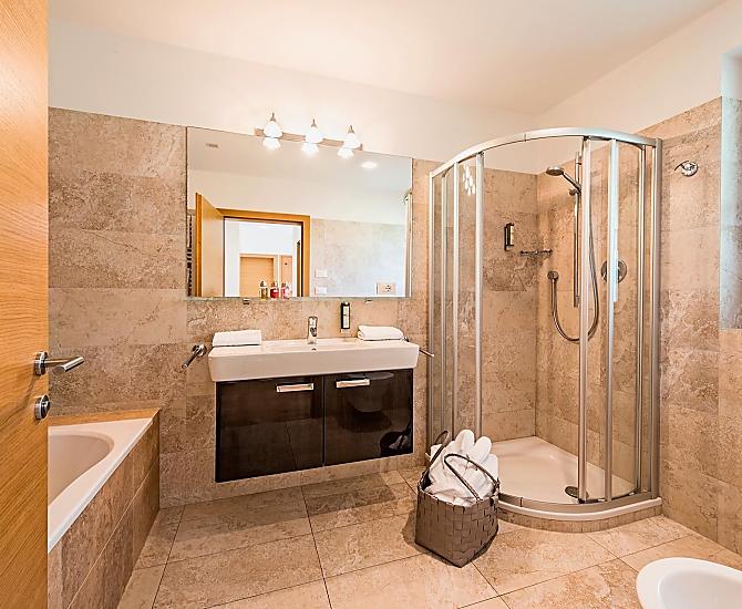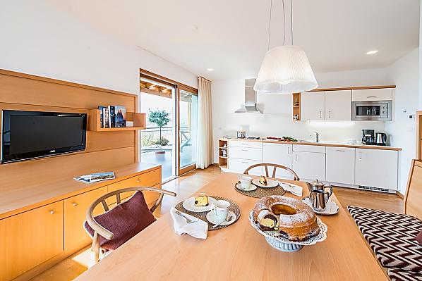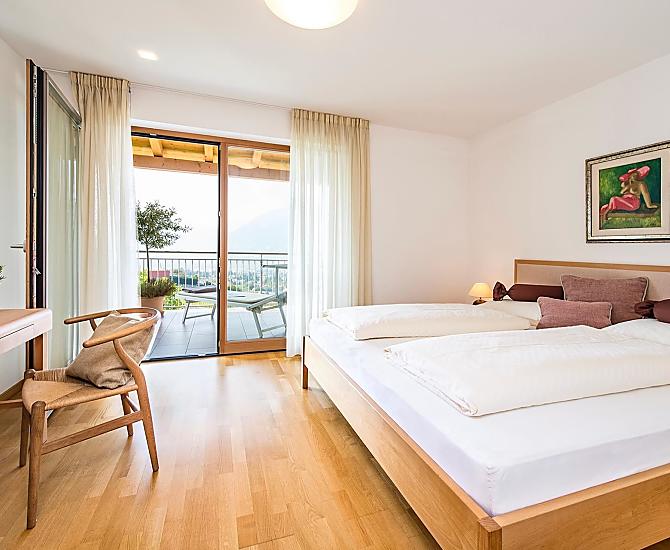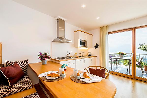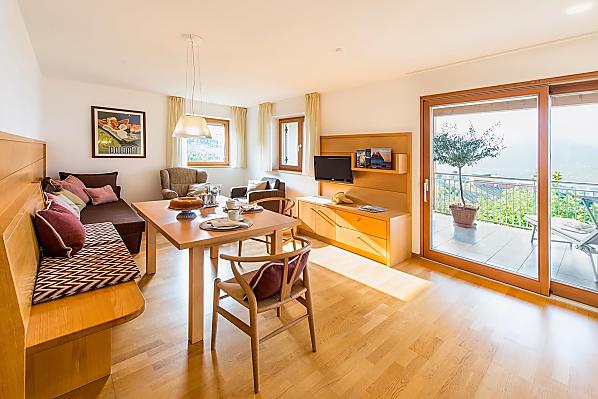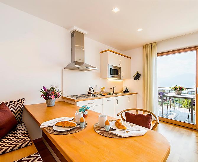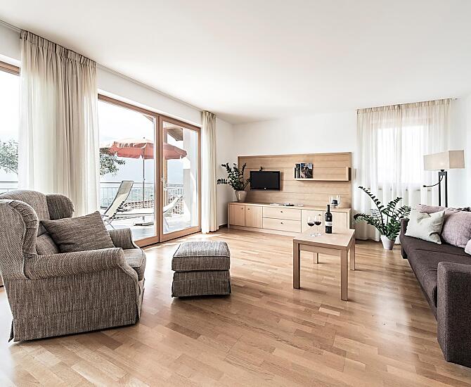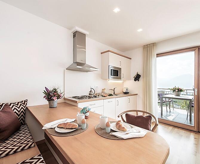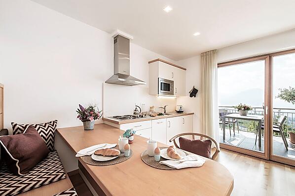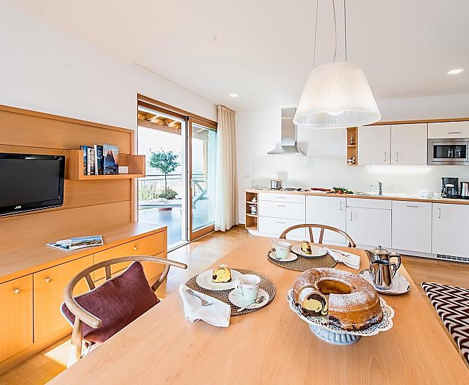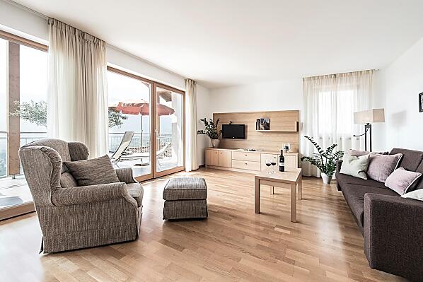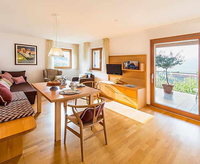 V apartmánu přivádějí velká okna přírodu přímo dovnitř. Skutečným klenotem je prostorná, slunná terasa orientovaná na jih. Vyhřívaný bazén s mediteránní odpočinkovou loukou je po náročné túře ideálním místem pro „dolce far niente“. Večer na vás čekají útulné šenky, pizzerie nebo restaurace v Schenna a okolí.