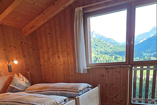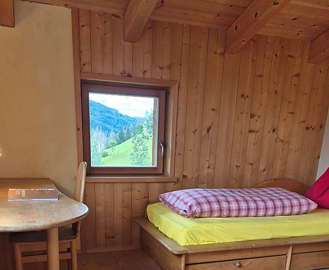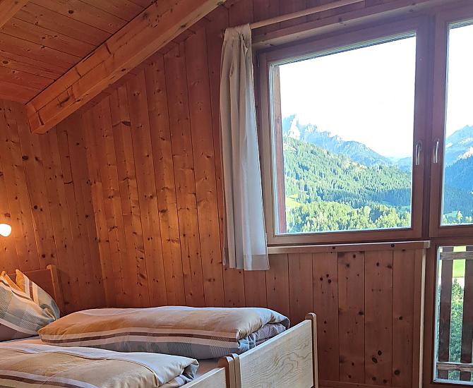 V hostinské části – u prosklené stěny – se vám naskytne nádherný výhled do údolí a na Dolomity.