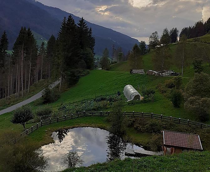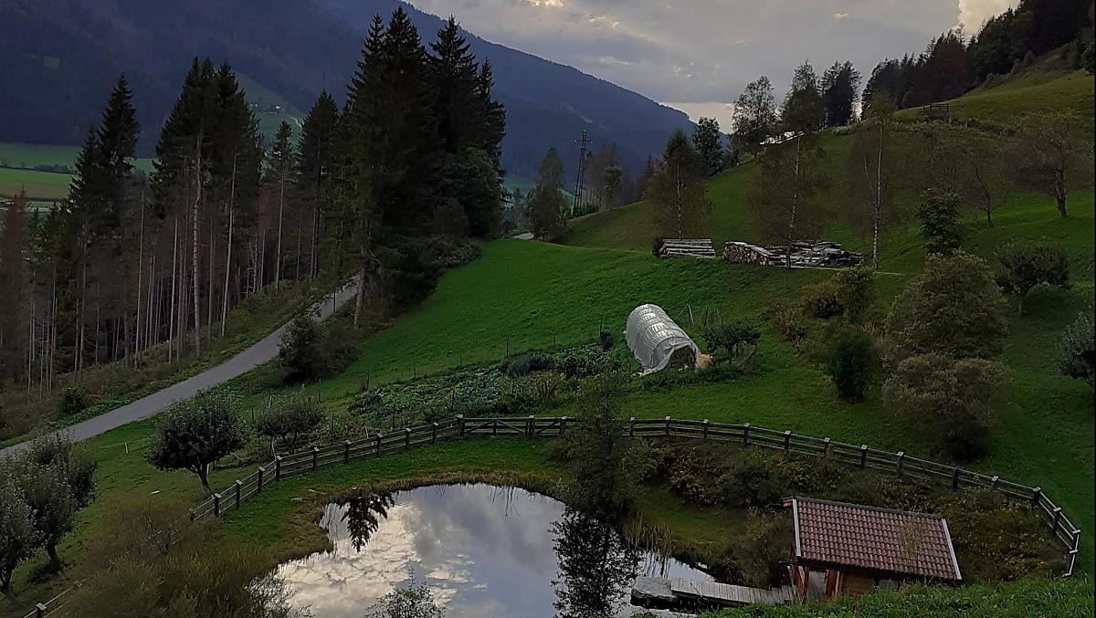 Ekostatku najdete na klidném místě uprostřed přírody – obklopen lesem, keři a květnatými loukami. Jen pár kroků od domu se můžete vydat na stezku léčivých rostlin. U jezírka začíná náš zeleninový záhon, odkud vede polní cestička do zahrady a k terase, kde v létě dozrávají červený rybíz a maliny. (Výzkumné centrum Laimburg, paní Kathrin Plunger, nám dne 19. 08. 2025 předalo plaketu a certifikát za ekologické zahradničení „Natur im Garten“, protože na našem statku byla splněna všechna klíčová kritéria biodiverzity potřebná k tomuto ocenění).