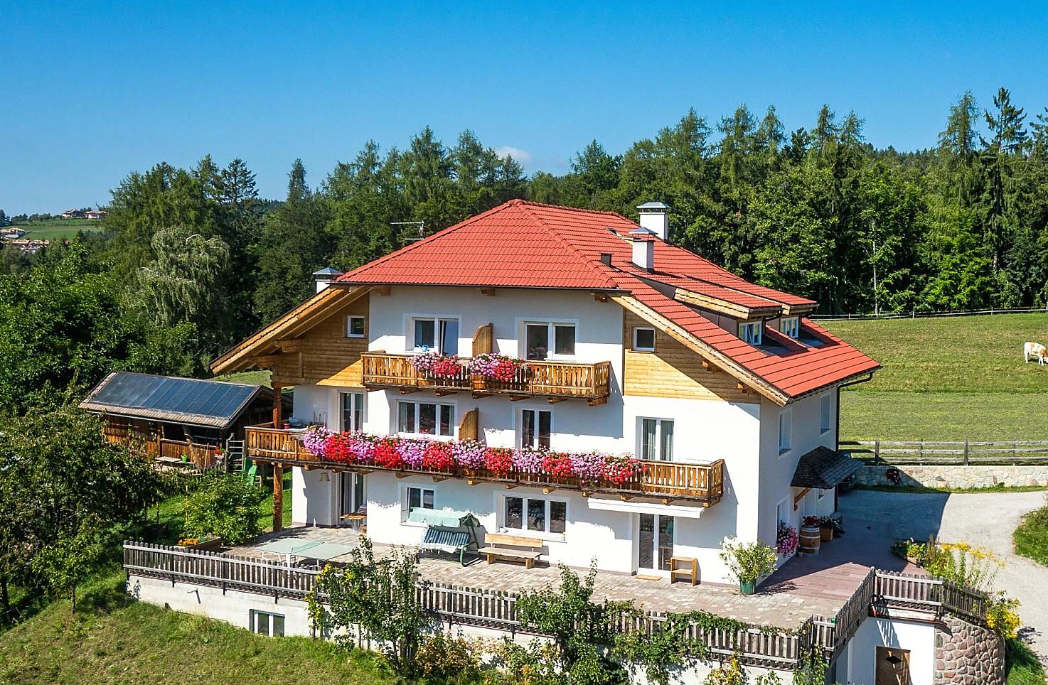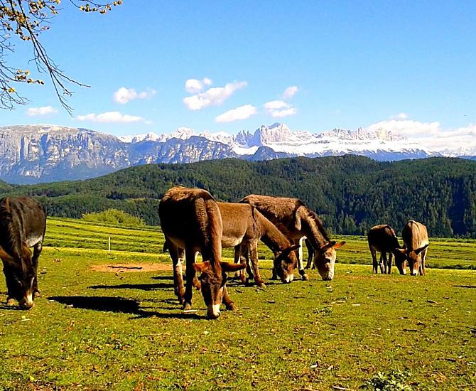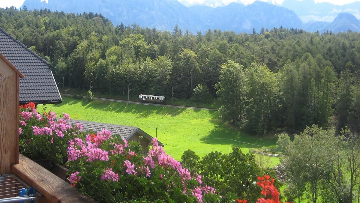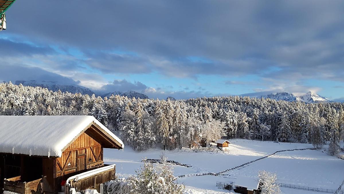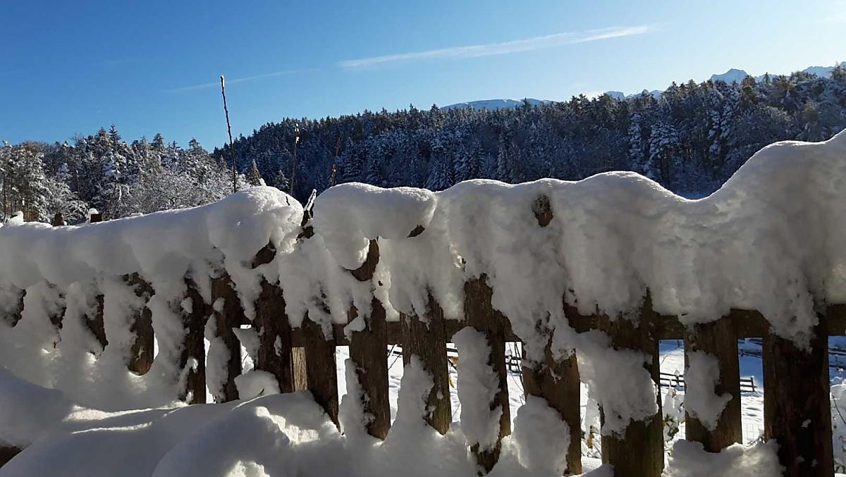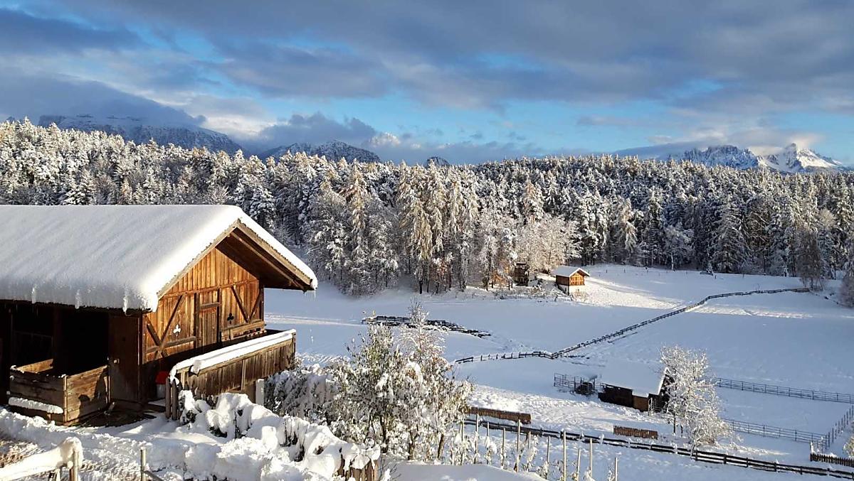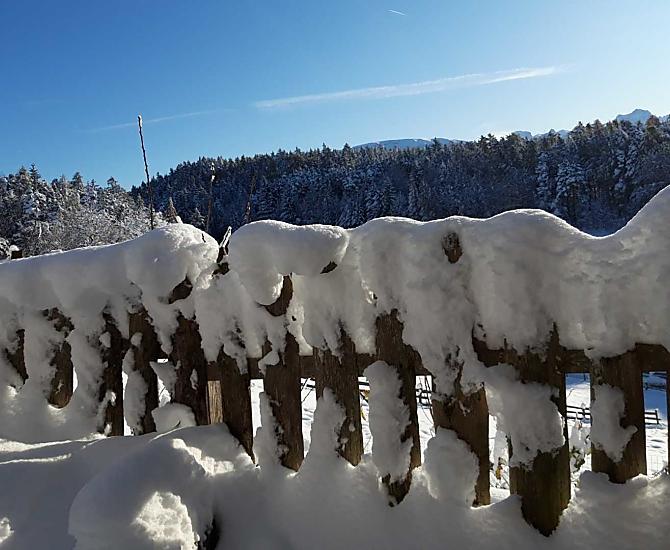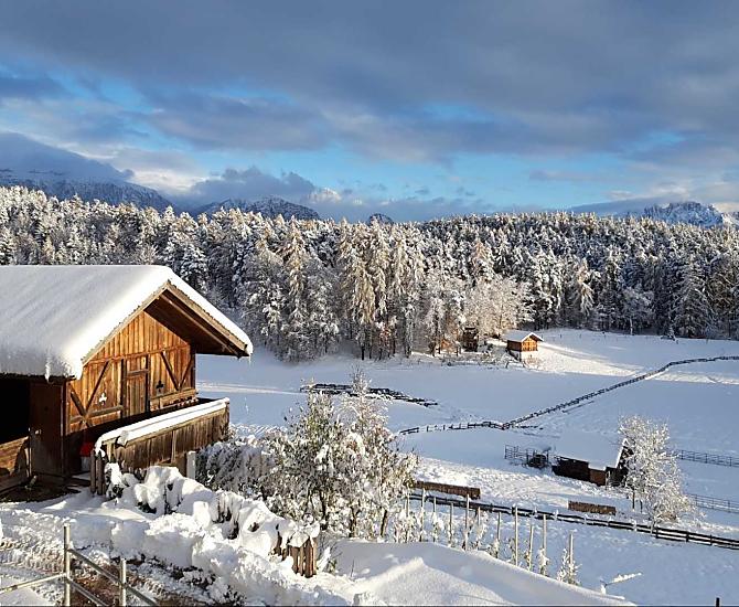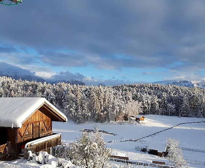 Náš horský statek s mnoha zvířaty se nachází v nadmořské výšce 1250 metrů uprostřed luk a lesů, na konci cesty. Rittenská úzkokolejka je vzdálená jen několik minut chůze (bez hluku). K jezeru Wolfgsrubner See (jezero ke koupání se v zimě mění v kluziště) se dostanete rychle pěšky. Také ke koupalištím Klobenstein a Oberbozen se snadno dostanete městskou hromadnou dopravou a za několik minut pěšky.