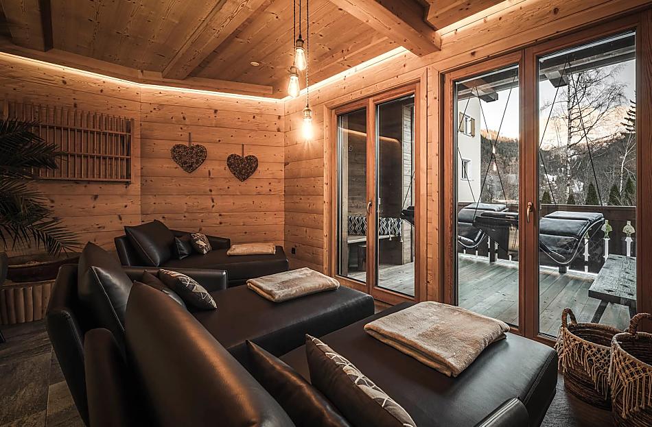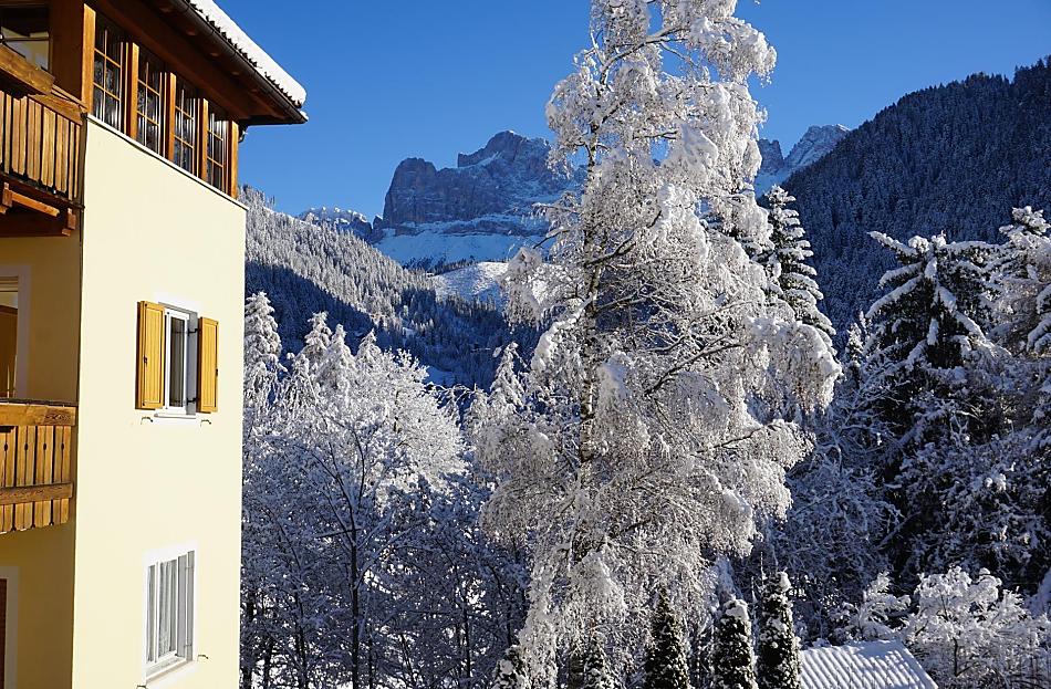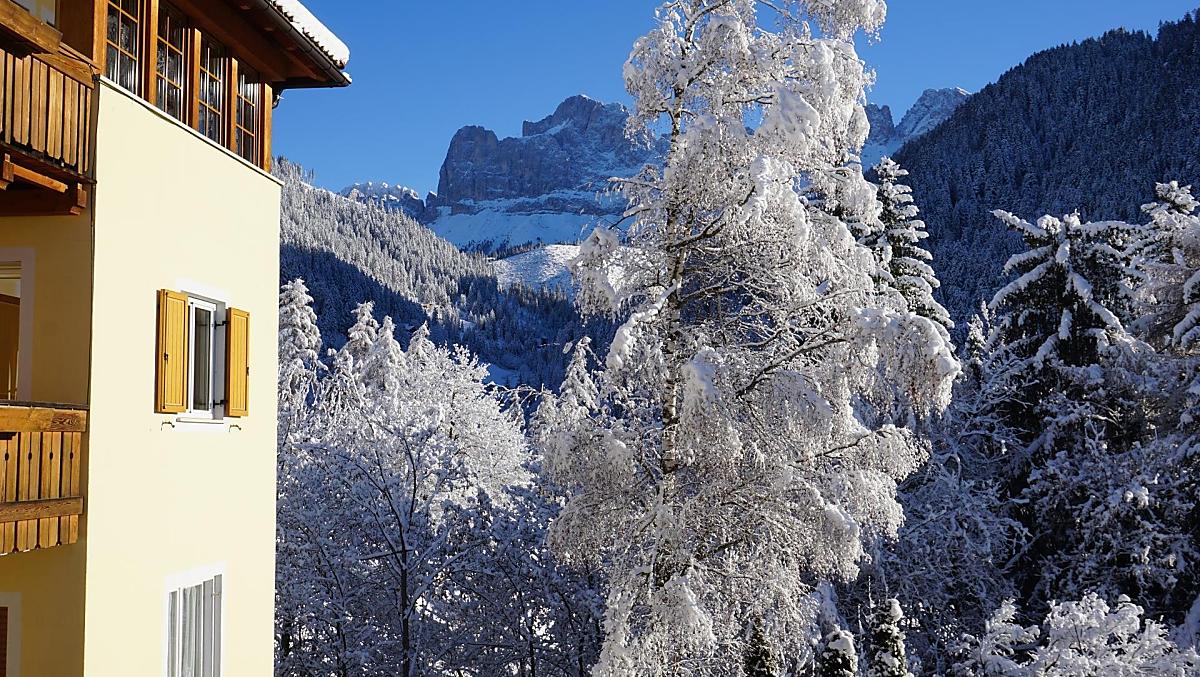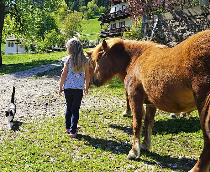 Prostorné prosluněné balkony pohladí po duši: pohádkový výhled na hory Rosengarten a Latemar, šplouchající kachny v průzračné vodě studánky, dva poníci na louce a vrnící kočka na lavičce pod starobylou, energii dodávající hruškou.