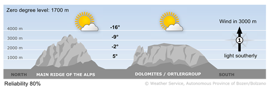 Maximum temperatures will range from 3° in the upper Pustertal Valley to 12° in the Unterland and Etsch Valley.