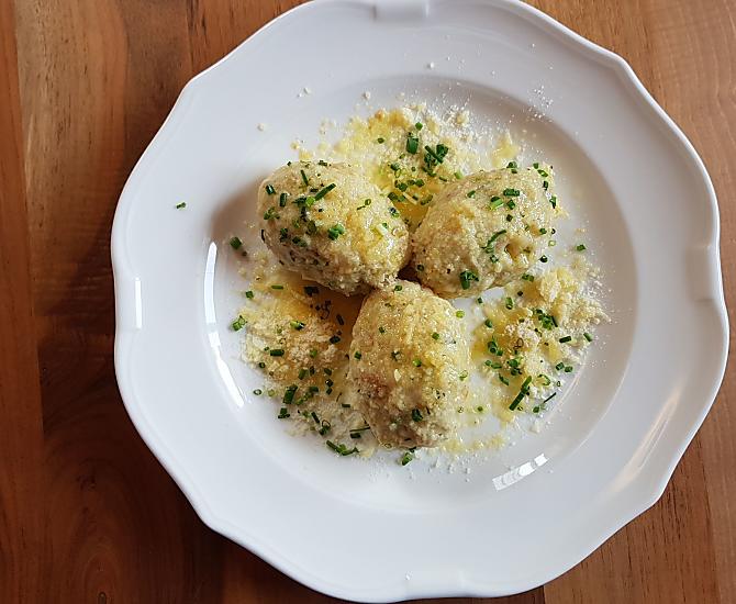 Polentové knedlíky s čekankou a omáčkou ze šedého sýraz jiných jihotyrolských statků